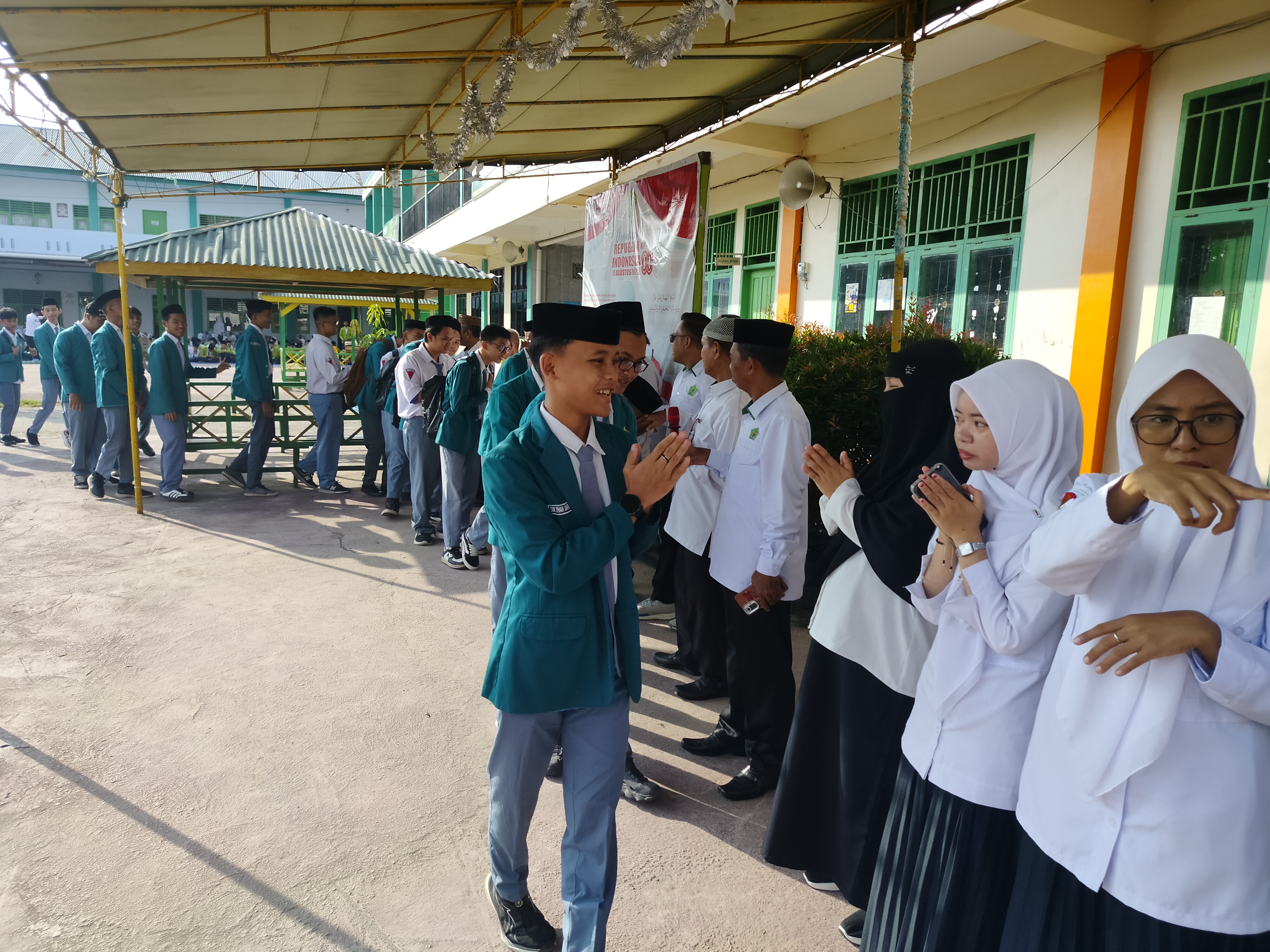 Pelaksanaan apel awal masuk madrasah pasca libur lebaran diakhiri dengan ramah-tamah atau salaman berjabat tangan antara santri dan para guru.